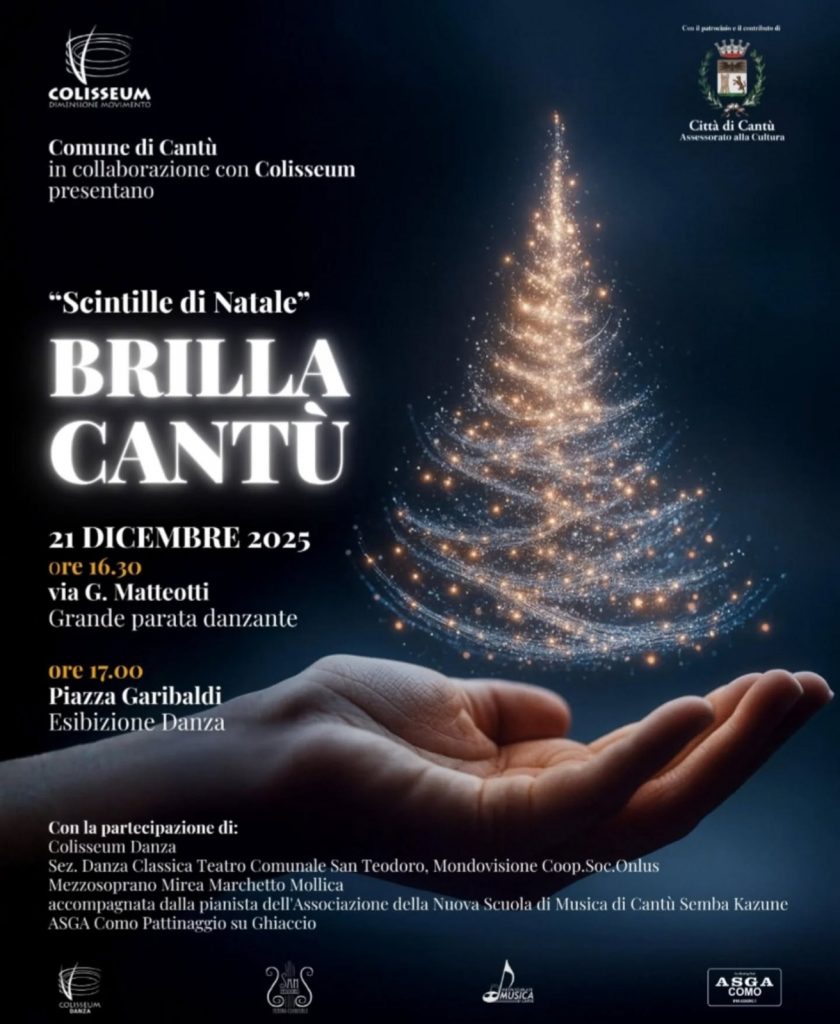Cantù si prepara a vivere un pomeriggio di grande suggestione con “Scintille di Natale – Brilla Cantù”, evento in programma il 21 dicembre 2025, promosso dal Comune di Cantù in collaborazione con Colisseum – Dimensione Movimento e curato dall’Assessore alla Cultura Isabella Girgi (Lega Cantù).